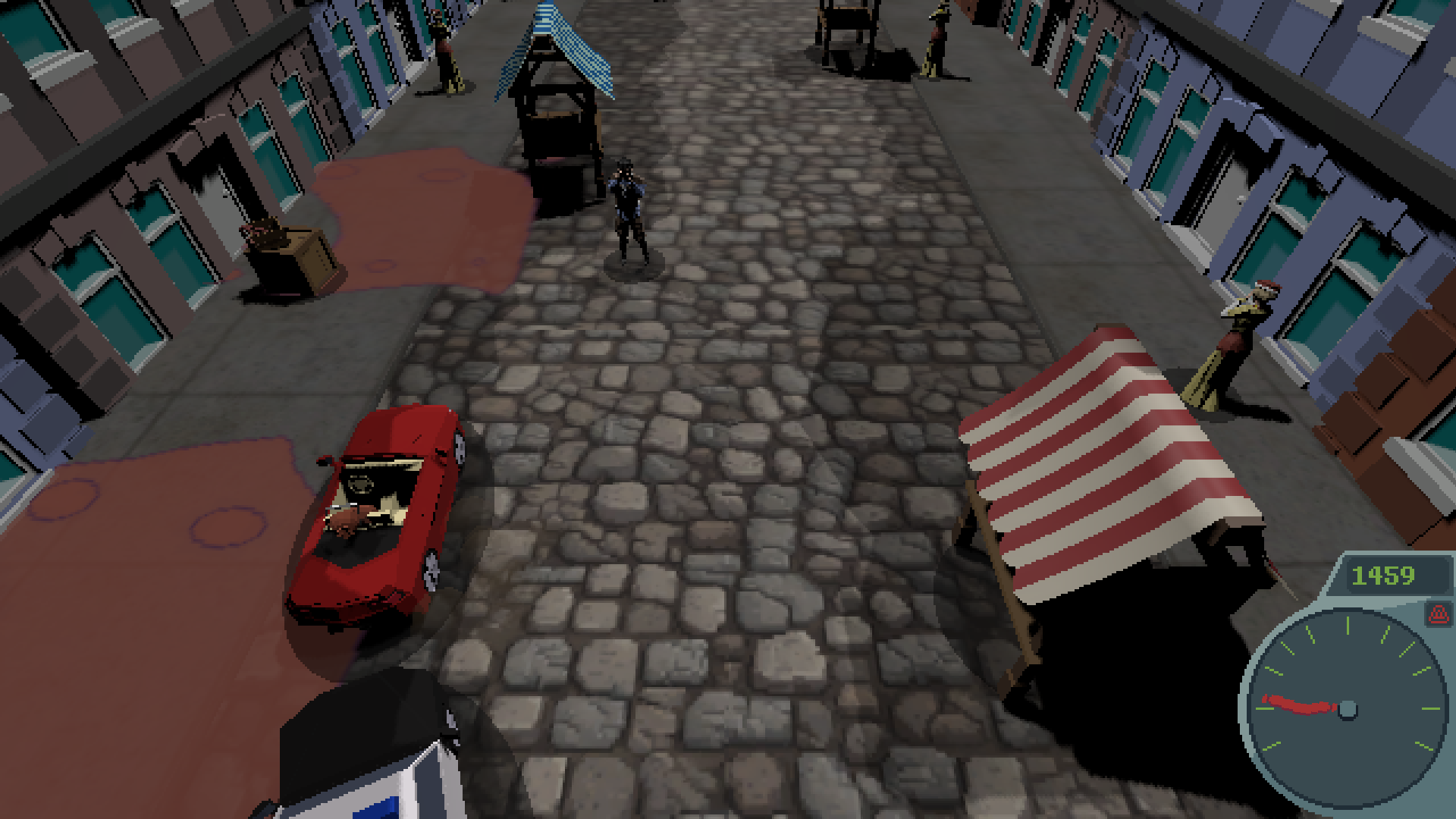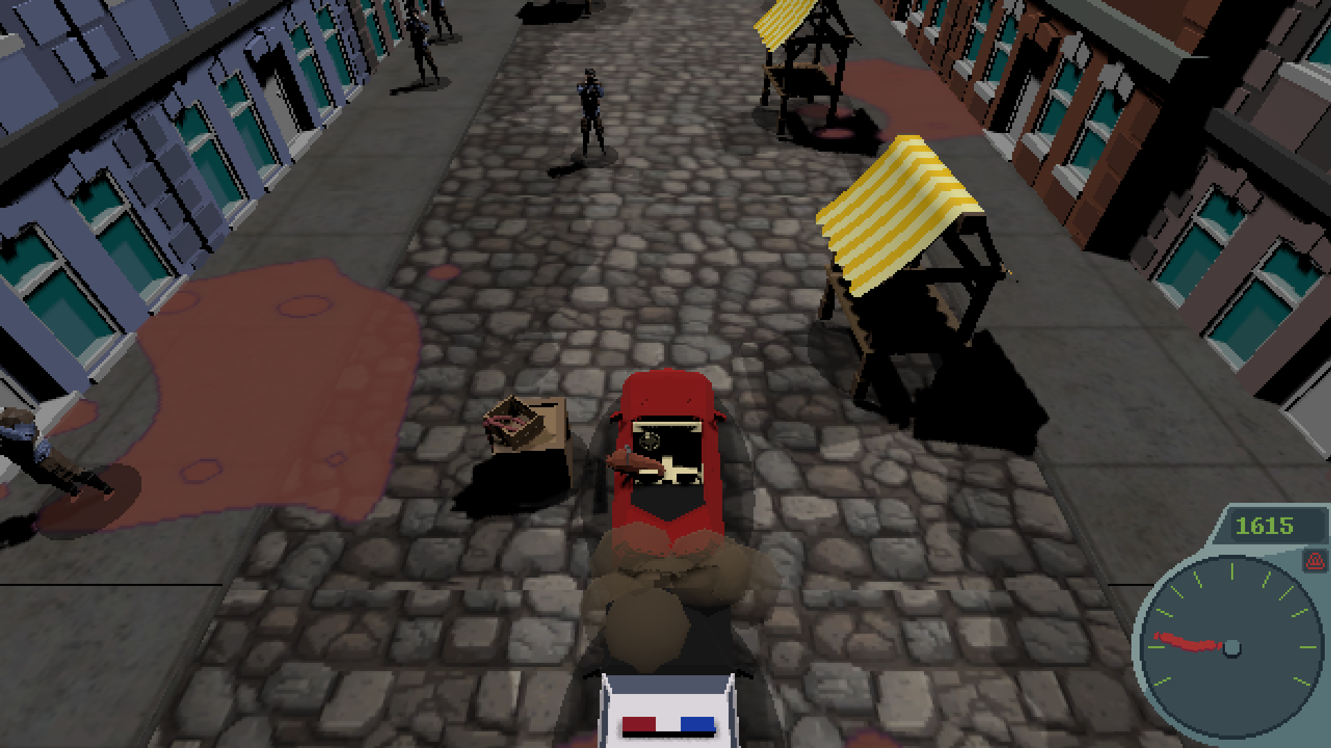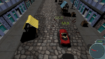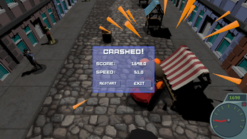 Using left and right buttons or A and D, drive into villagers and crates of sausages and speed into the distance.